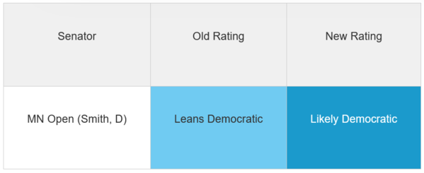 When the Minnesota and New Hampshire Senate races became open, we moved them from Likely Democratic to Leans Democratic as a nod to the increased uncertainty inherent in an open seat.