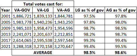In recent Virginia elections, there have always been more votes cast for governor than there were for lieutenant governor and attorney general, and typically there is slightly less of an undervote for attorney general than there is for lieutenant governor. That makes some intuitive sense, as attorney general is a higher-profile and more powerful office than lieutenant governor. Table 2 shows the total number of votes cast for the three offices this century, as well as the percentage of total gubernatorial votes that were cast in the other two races.